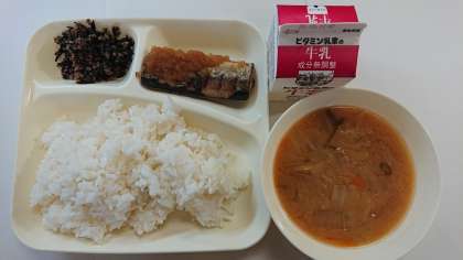 本日の献立は、さんまのみぞれかけ、味噌汁、牛ひじきそぼろ、ごはん、牛乳です。
