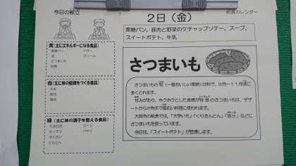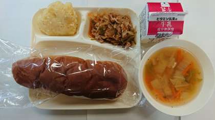 本日の献立は、豚肉と野菜のケチャップソテー、スープ、スイートポテト、黒糖パン、牛乳です。