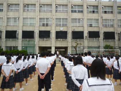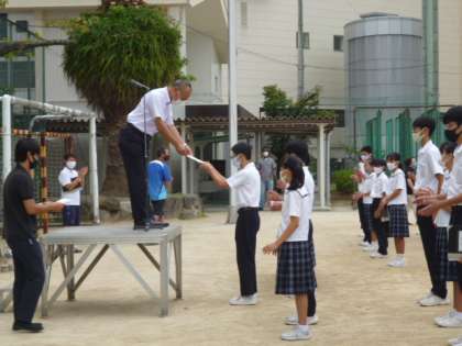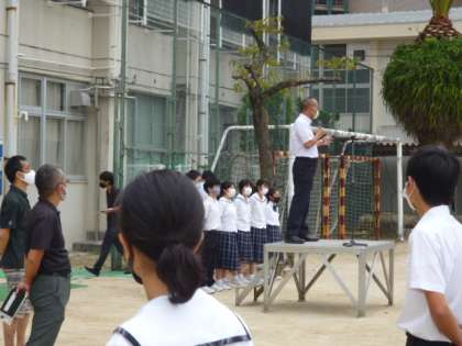 今朝の空は雲でおおわれ、少し涼しい風が吹いています。生徒会の進行で、全校集会が行われました。
