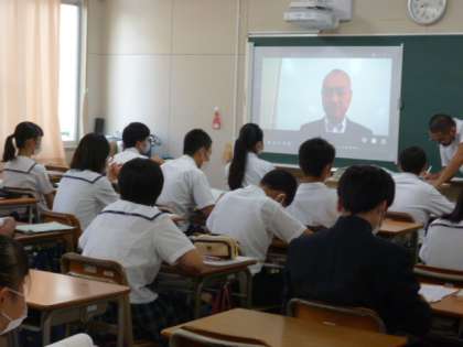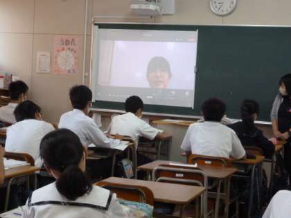 大阪成蹊大学の大学生2名が、10〜12月の週1回(水曜日)のペースで本校に来て、「学校体験活動」を行います。今朝は、その2人が3年生の学年集会であいさつをしました。また、1・2年生の朝の学活の時間に、双方向通信(Teams)を使って、教室で、スクリーンに映った顔と声であいさつをしました。