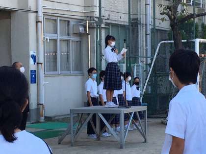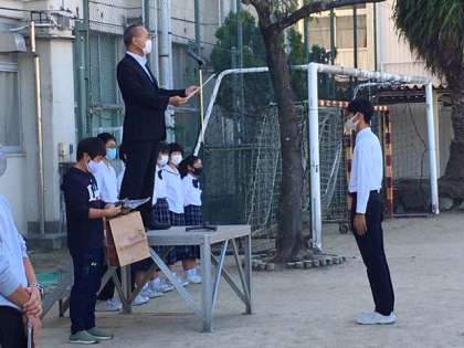 次に表彰です。大阪中学総体 陸上部走高跳び 新山君が1m91cmの記録で1位の表彰をしました。 その後、今日の午後の体育大会全校練習の連絡をしました。