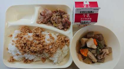 本日の献立は、豚肉のねぎ醤油焼き、吹き寄せ煮、ツナの大豆そぼろ、ごはん、牛乳です。
