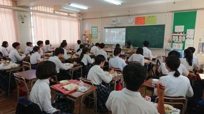3年生の学級では、体育大会「集団演技」練習をみんなで確認しながら給食をいただいていました。