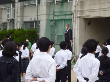 少し寒いですが、全員で元気よく朝の挨拶、校長先生のお話です。