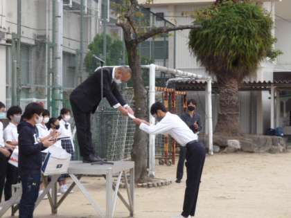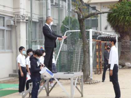 次に表彰です。17日(土)に神奈川県の日産スタジアムで行われたJOCジュニアオリンピックカップ 全国中学生陸上競技大会2020に本校の陸上部 走高跳の新山君が出場し、1m83cmの記録で3位に入賞しました。賞状と銅メダルを校長先生から授与しました。その後、生徒会からは、「赤い羽根」の募金活動についての連絡があり、皆さんに募金を呼びかけました。