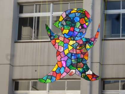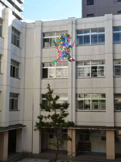 中庭の上空には、3年の作品「さるぼぼ」があります。