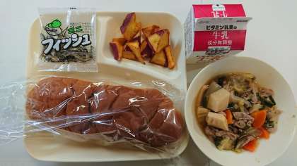 本日の献立は、豚肉といかの中華煮、大学芋、黒糖パン、ミニフィッシュ、牛乳です。