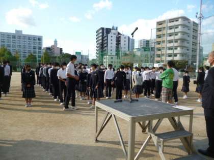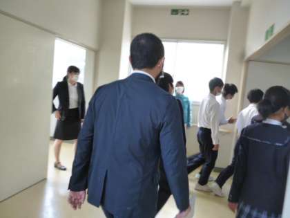 地震の発生の合図から、避難の指示、すみやか運動場へ出ました。