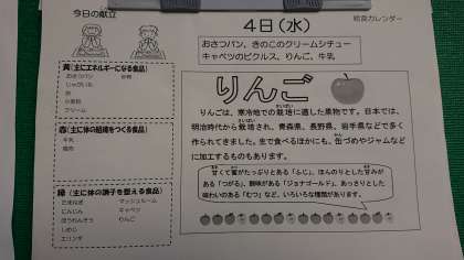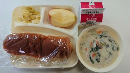 本日の献立は、きのこのクリームシチュー、キャベツのピクルス、おさつパン、牛乳、りんごです。