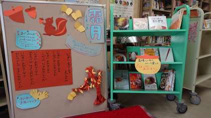 図書館の入り口の飾りつけを「霜月」バージョンにかえてくださいました。