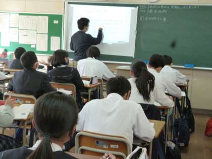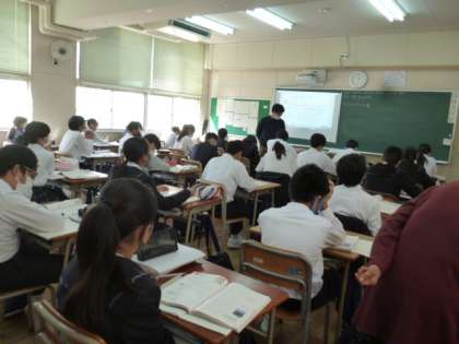 5時限目 1年1組の数学科の授業で、「学力向上推進事業」の研究授業が行われました。 数学科の 西山先生が授業を行いました。2つの数の変化の様子から、反比例の関係を考えています。質問に積極的に答える声もありました。