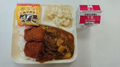 本日の献立は、カツカレーライス、カリフラワーのピクルス、煎り黒豆、牛乳です。