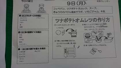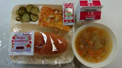 本日の献立は、ツナポテトオムレツ、ケチャップ、きゅうりのバジル風味サラダ、スープ、コッペパン、いちごジャム、牛乳です。