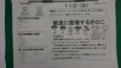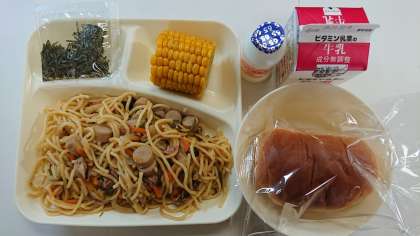 本日の献立は、ウインナーときのこの醤油風味スパゲッティ、焼きとうもろこし、黒糖ロールパン、牛乳、発酵乳です。