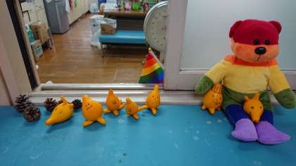 華道部の皆さんが以前に校長室前にも活けてくれた「フォックスフェイス」の実が、かわいくなって保健室前で皆さんを出迎えてくれています。