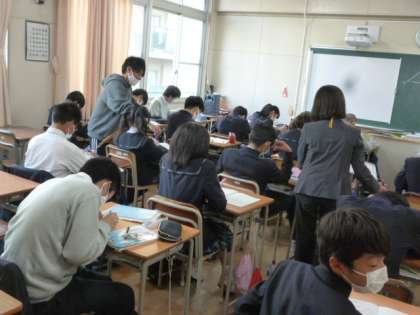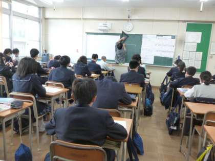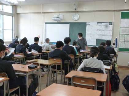 6時限目 2年2組の数学科の授業で、「学力向上推進事業」の研究授業が行われました。 数学科の 増井先生が授業を行いました。角の二等分線の作図をして、三角形の合同条件を使って考えました。