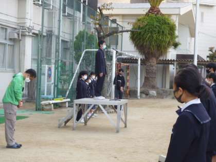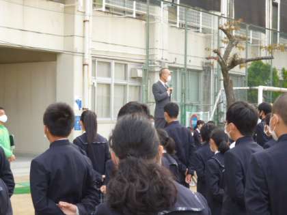 さわやかな快晴の空のもと、全校集会が行われました。