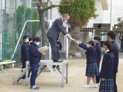 つづいて、表彰を行いました。体育大会で学級旗の表彰をしました。