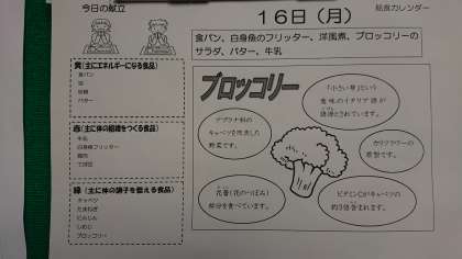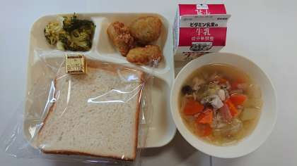 本日の献立は、白身魚のフリッター、ブロッコリーのサラダ、洋風煮、食パン、バター、牛乳です。