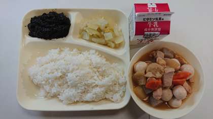 本日の献立は、関東煮、白菜の甘酢和え、海苔の佃煮、ごはん、牛乳です。