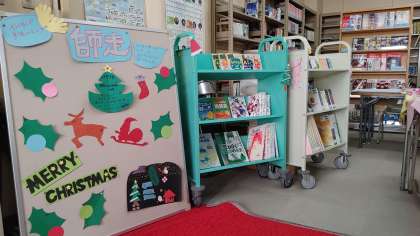 図書館入り口の飾りつけも「クリスマスバージョン」にかえてくださいました。