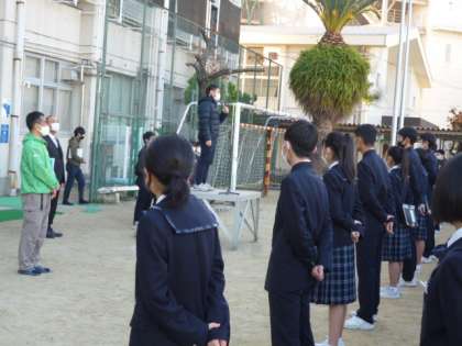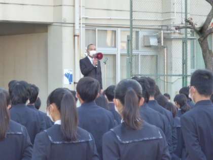 朝晩は寒くなりましたが、元気に登校した生徒たちは、運動場に出て、全校集会が行われました。