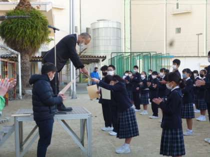 次に、先日校長室において「税の作文」で入賞した4名を、今日は全校集会で校長先生から表彰状の伝達が行われました。