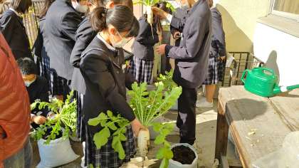 技術科の授業では、9月7日に種をまいた「大根」の収穫を行いました。