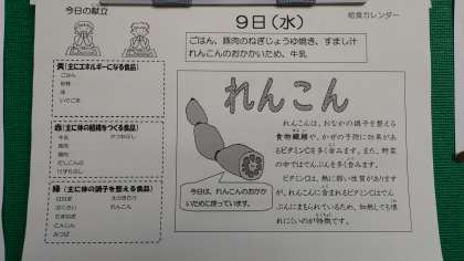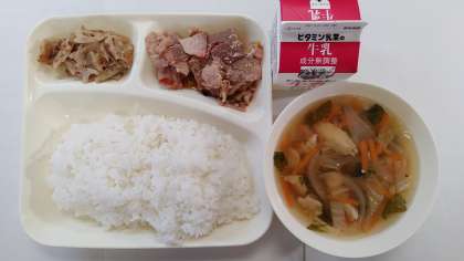 本日の献立は、豚肉のねぎ醤油焼き、蓮根のおかか炒め、すまし汁、ごはん、牛乳です。