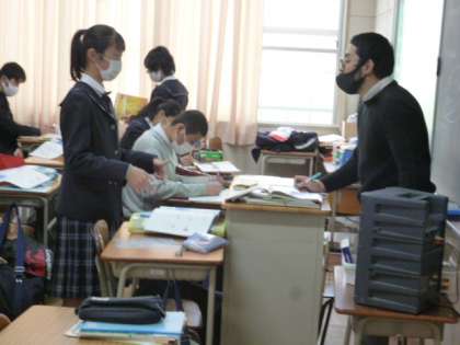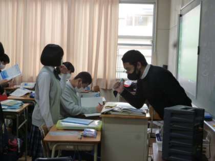 英語では、生徒が1人ずつ先生と向かい合い、手振りを交えながら英語で話しました。