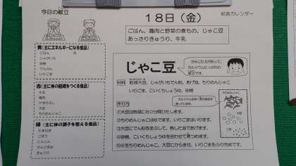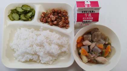 本日の献立は、鶏肉と野菜の煮物、あっさりきゅうり、じゃこ豆、ごはん、牛乳です。