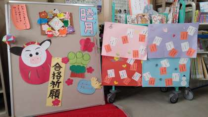 図書館の入り口の飾りつけも、お正月バージョンにかえてくださいました。