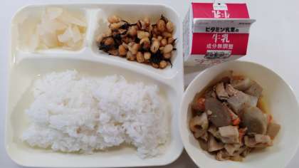本日の献立は、筑前煮、ひじき豆、大根の柚子風味、ごはん、牛乳です。