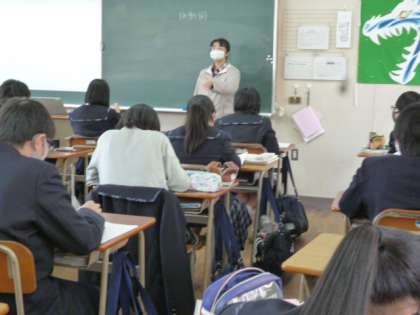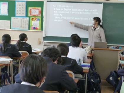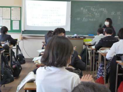 英語では、先生が文を読むのに続いて、生徒たちが読んでいます。