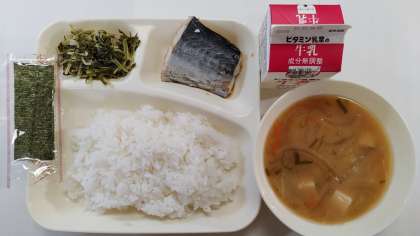 本日の献立は、さごしの醤油だれかけ、水菜の煮びたし、焼き海苔、ごはん、牛乳です。