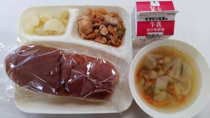 本日の献立は、鶏肉のバーベキューソテー、焼きじゃが、ウインナーとキャベツのスープ、黒糖パン、牛乳です。