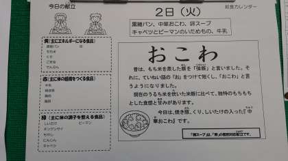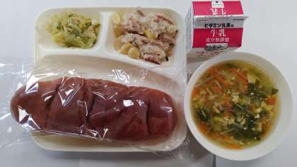 本日の献立は、中華おこわ、キャベツとピーマンの炒め物、卵スープ、黒糖パン、牛乳です。