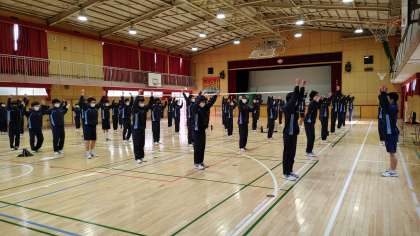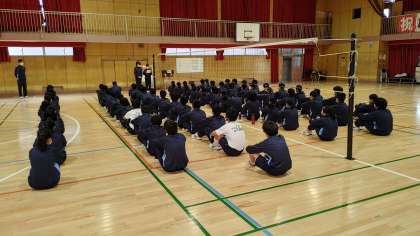 体育館での開会式、ラジオ体操の後、いよいよ球技大会開始です。