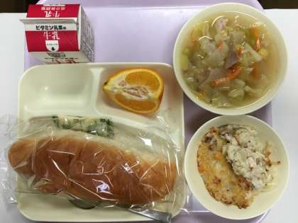 本日の献立は、押麦のグラタン、スープ、コッペパン、ソフトマーガリン、牛乳、いよかんです。