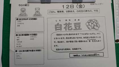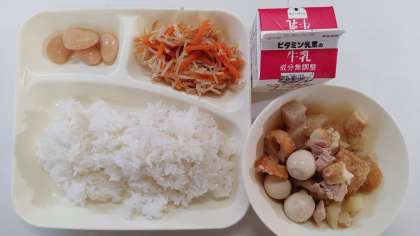 本日の献立は、関東煮、甘酢和え、白花豆、ごはん、牛乳です。