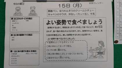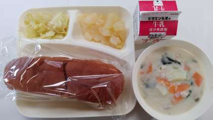 本日の献立は、ほうれん草のクリームシチュー、キャベツのサラダ、黒糖パン、洋梨(カット缶)、牛乳です。
