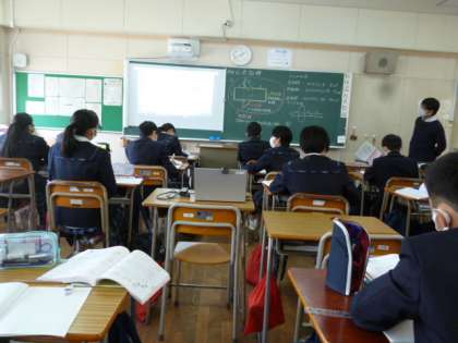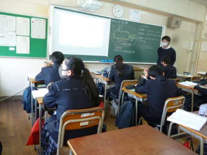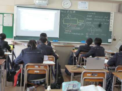 5時限目 1年1組の数学科の授業で、「学力向上推進事業」の研究授業が行われました。 数学科の 西山先生が授業を行いました。立体の展開図を学んでいます。