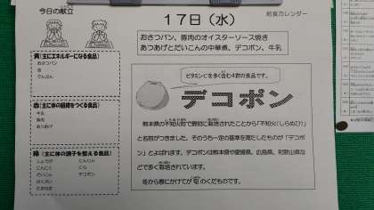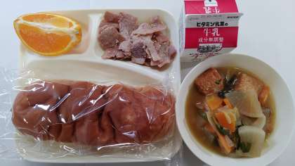 本日の献立は、豚肉のオイスターソース焼き、厚揚げと大根の中華煮、おさつパン、牛乳、デコポンです。