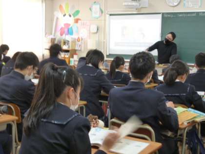 教科書の英文を先生に続いて、音読しています。しっかり、発音の練習をしました。