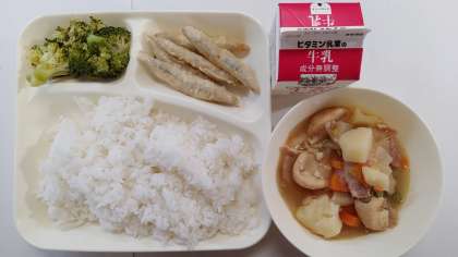 本日の献立は、きびなごの天婦羅、ブロッコリーの胡麻和え、一口がんもとじゃがいもの煮物、ご飯、牛乳です。