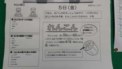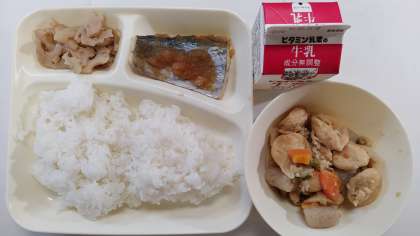 本日の献立は、さごしのおろし醤油かけ、一口がんもと里芋の味噌煮、蓮根の炒め物、ごはん、牛乳です。