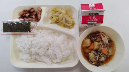 本日の献立は、肉じゃが、白菜の柚子風味、とら豆の煮もの、焼き海苔、ごはん、牛乳です。