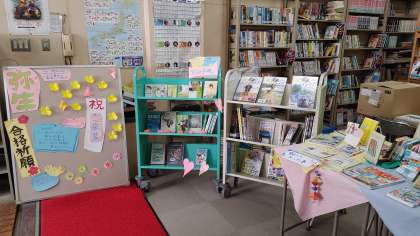 図書館をのぞくと、折り紙で折ったお雛様が飾られていました。