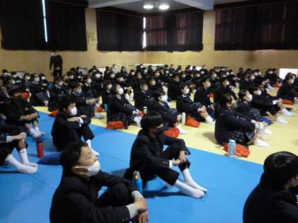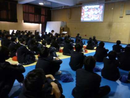6時限目 1年生は「合唱コンクール」の後、武道場へ入り、防災学習を行いました。