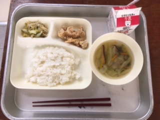 今日の給食は、鶏のから揚げ、中華スープ そしてチンゲンサイともやしの甘酢あえ でした。
